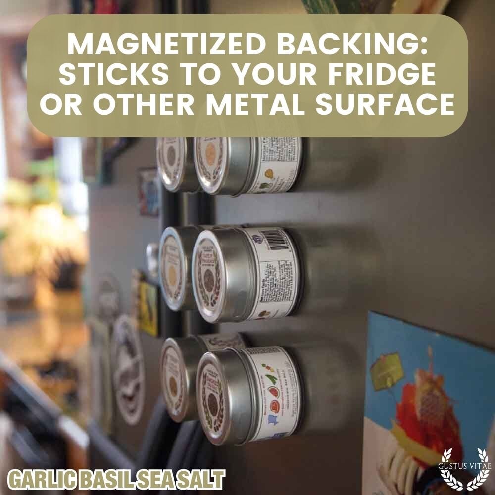 Magnetized backing: tins sticks to your fridge or other metal surface.