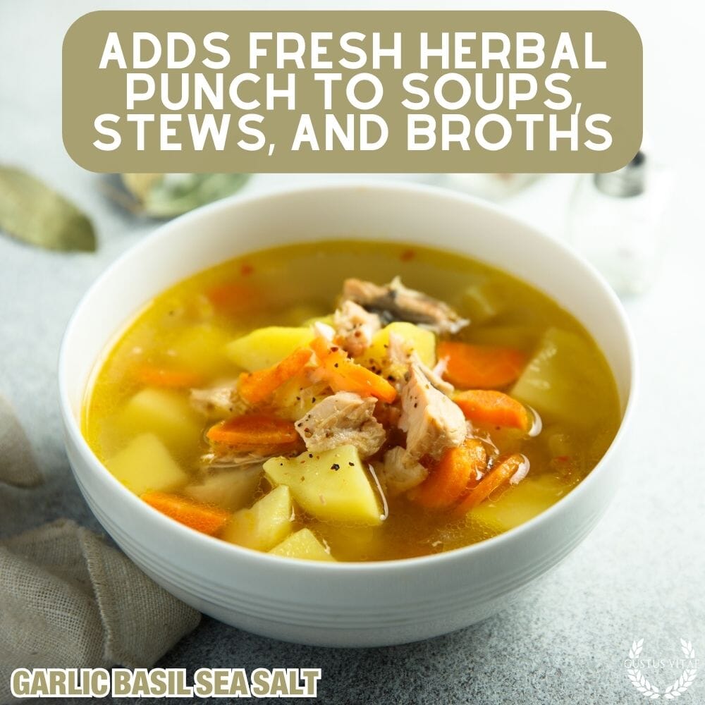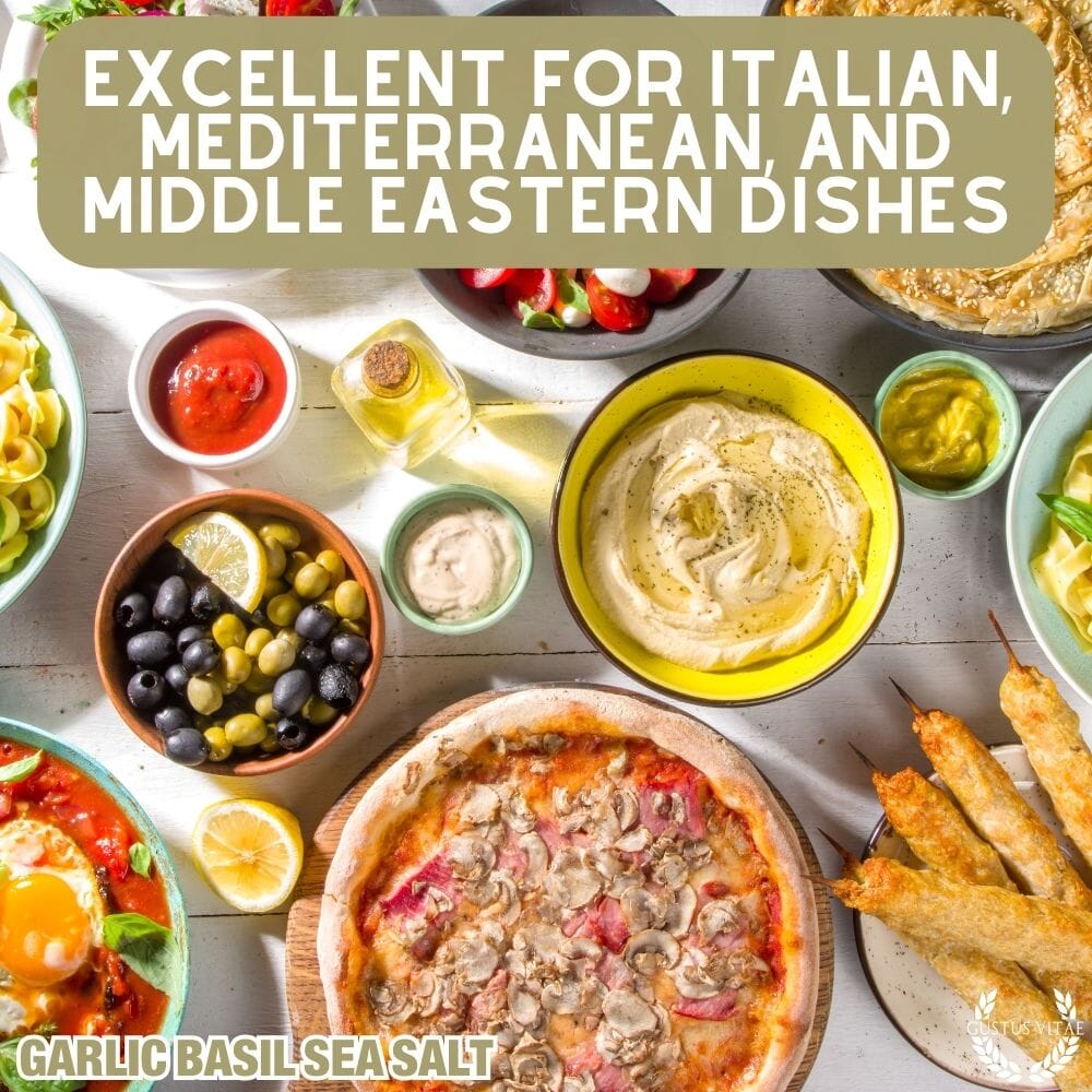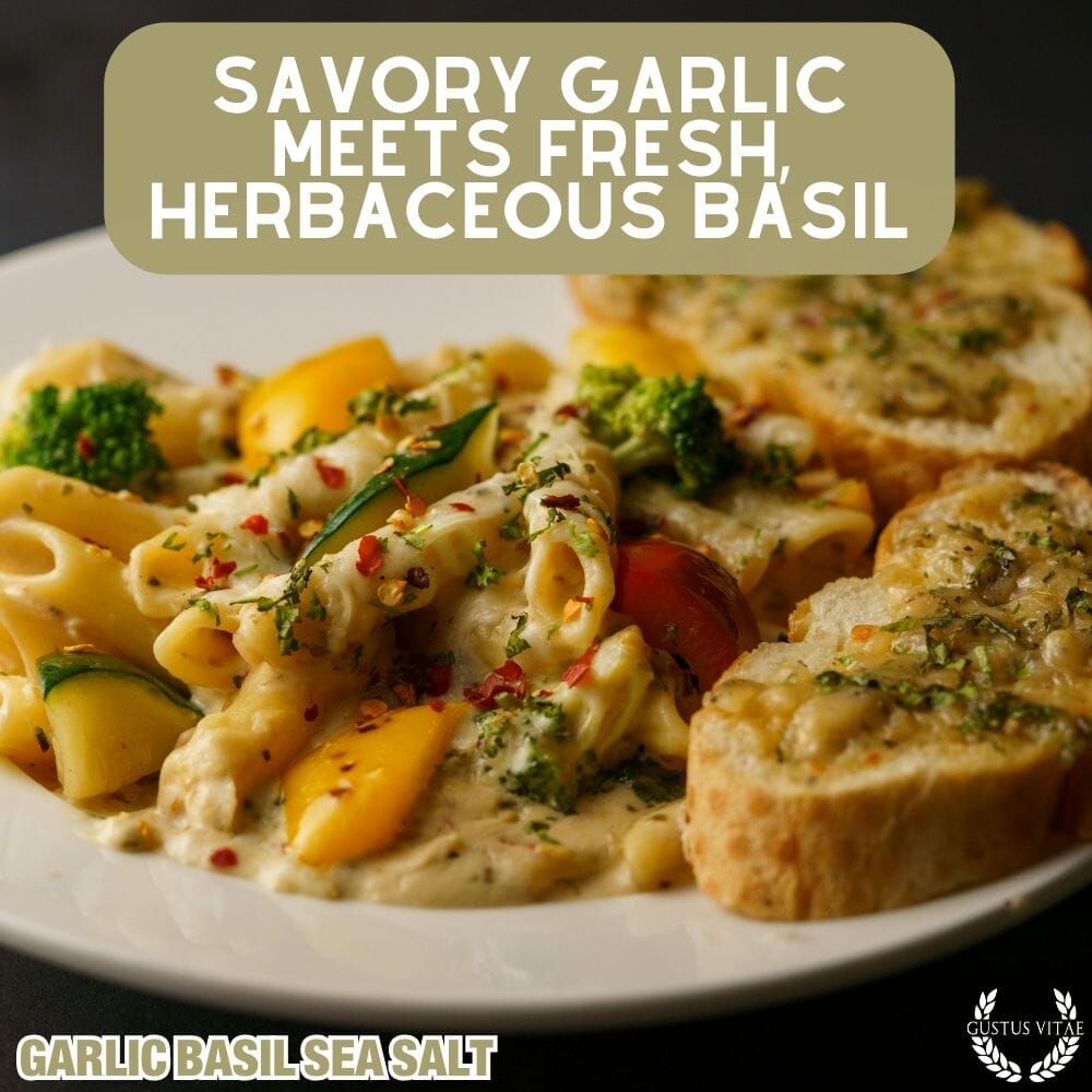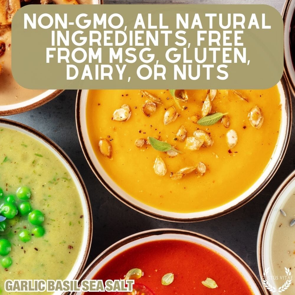 Garlic Basil Sea Salt Contains: Sea Salt, Garlic, Basil.