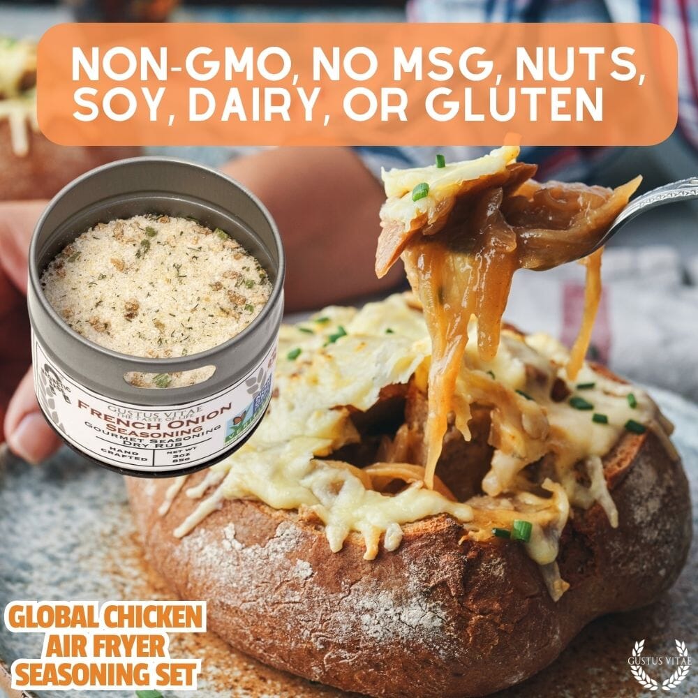 French Onion Seasoning: Sea Salt, Onion, Sugar, Dill Tips, Chives, Garlic, Basil, Chervil, Tarragon, White Pepper, Parsley.