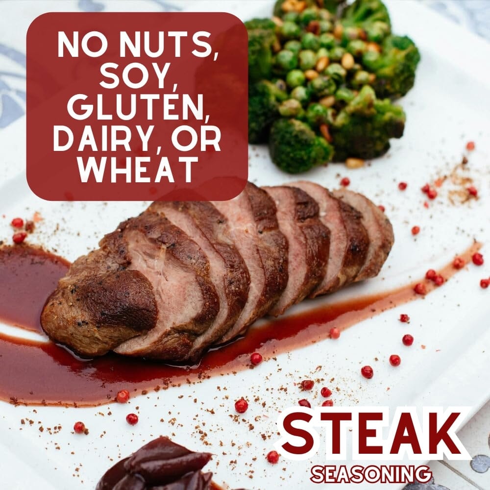 Everything But The Steak Seasoning Contains: Garlic, Onion, Sea Salt, Crushed Black Pepper, Coriander Seed, Dried Chili Peppers, Paprika, Sugar, Celery Seed, Red Bell Pepper, Parsley.