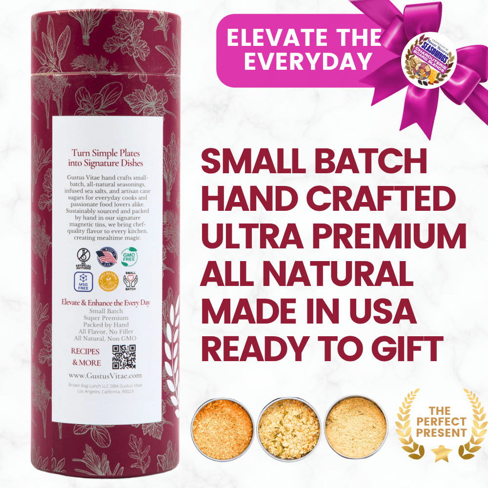 We craft each blend in limited batches using all-natural, non-GMO ingredients, layered for balance so flavors play nicely with rich cheeses, salty meats, and sweet fruit. Sprinkle as a finisher, whisk into dips, or fold into compound butters—this set is the board-builder’s toolkit you’ll reach for again and again. Presented in a handsome, ready-to-gift tube with our signature magnetic tins (they stick right to the fridge), it’s the thoughtful, premium present every host will love.