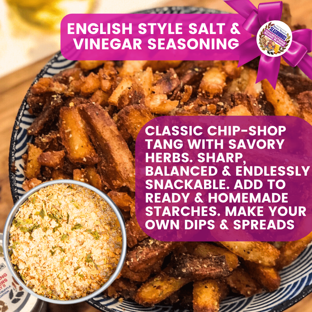English-Style Savory Salt & Vinegar Seasoning — Classic chip-shop tang with savory herbs; sharp, balanced, and endlessly snackable.