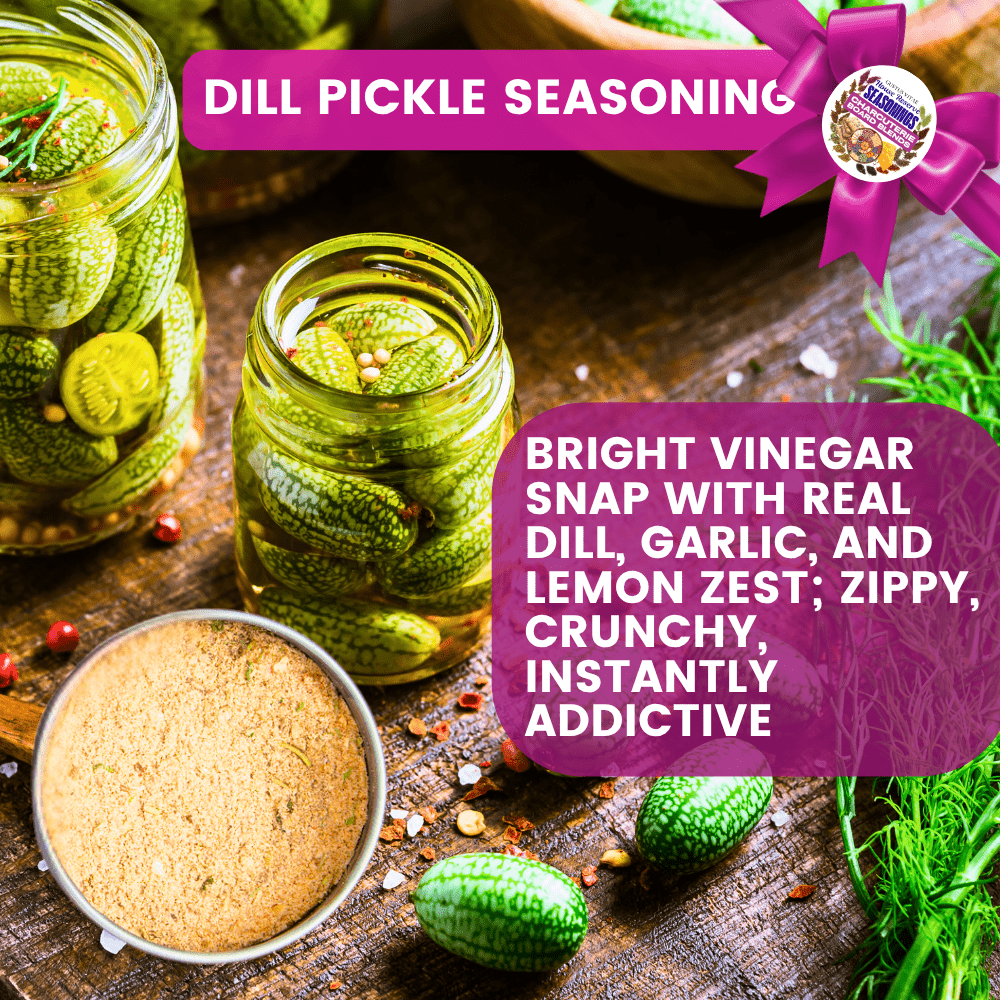 Dill Pickle Seasoning — Bright vinegar snap with real dill, garlic, and lemon zest; zippy, crunchy, instantly addictive.
