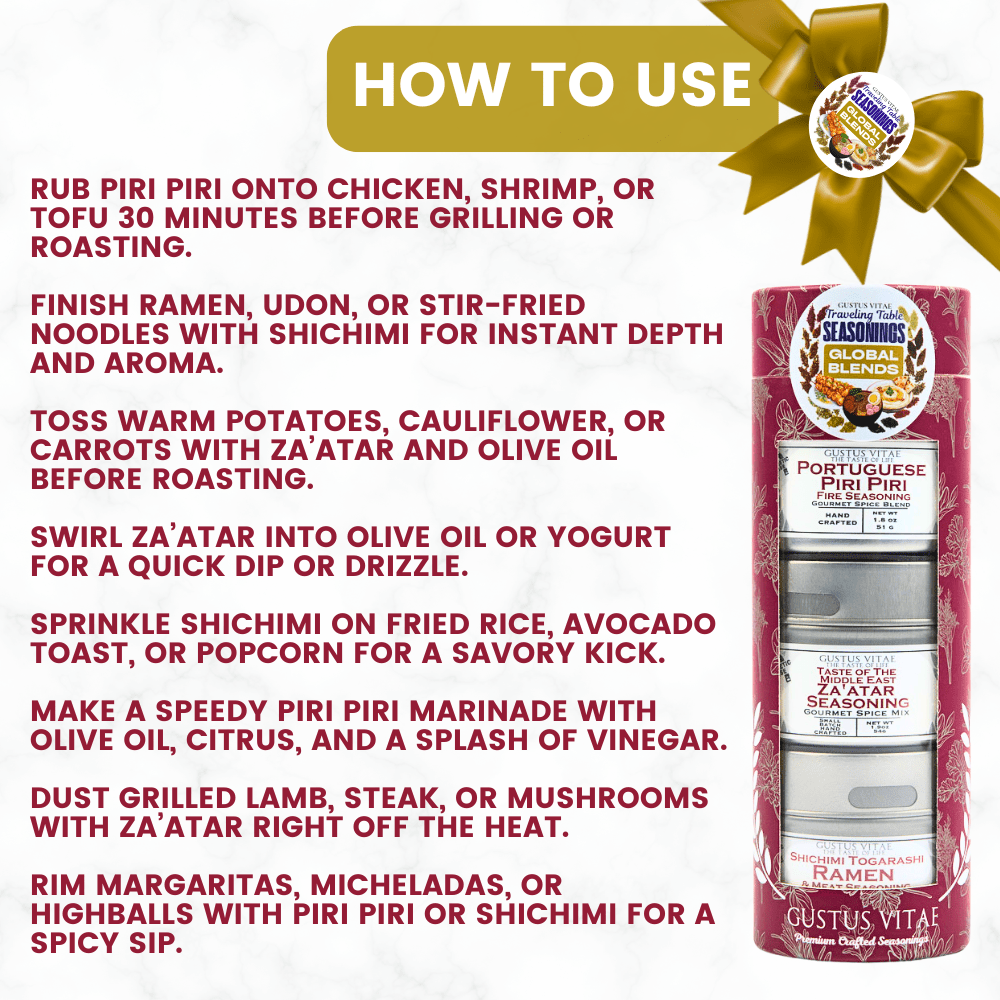 Shake, sprinkle, done—this globetrotting trio turns whatever you’re cooking into something unforgettable. Our Global Blends: The Traveling Table Seasonings Gift Pack brings big, transportive flavor to weeknights and dinner parties alike—no complicated recipes required. From citrusy Portuguese heat to herb-lifted Middle Eastern classics and umami-rich Japanese street-food vibes, it’s a world tour in three tins.