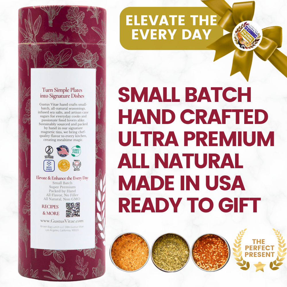 We craft each blend in limited batches using all-natural, non-GMO ingredients, layered for aroma, balance, and repeat-worthy flavor. Dust over roasted veg, rub onto grilled meats, finish noodle bowls, whip into dips, or swirl into olive oil for a fast drizzle—these do-it-all blends make “what’s for dinner?” feel like an adventure. Presented in a handsome, ready-to-gift tube with our signature magnetic tins (they stick right to the fridge), it’s a thoughtful, premium present every cook will reach for again and again.