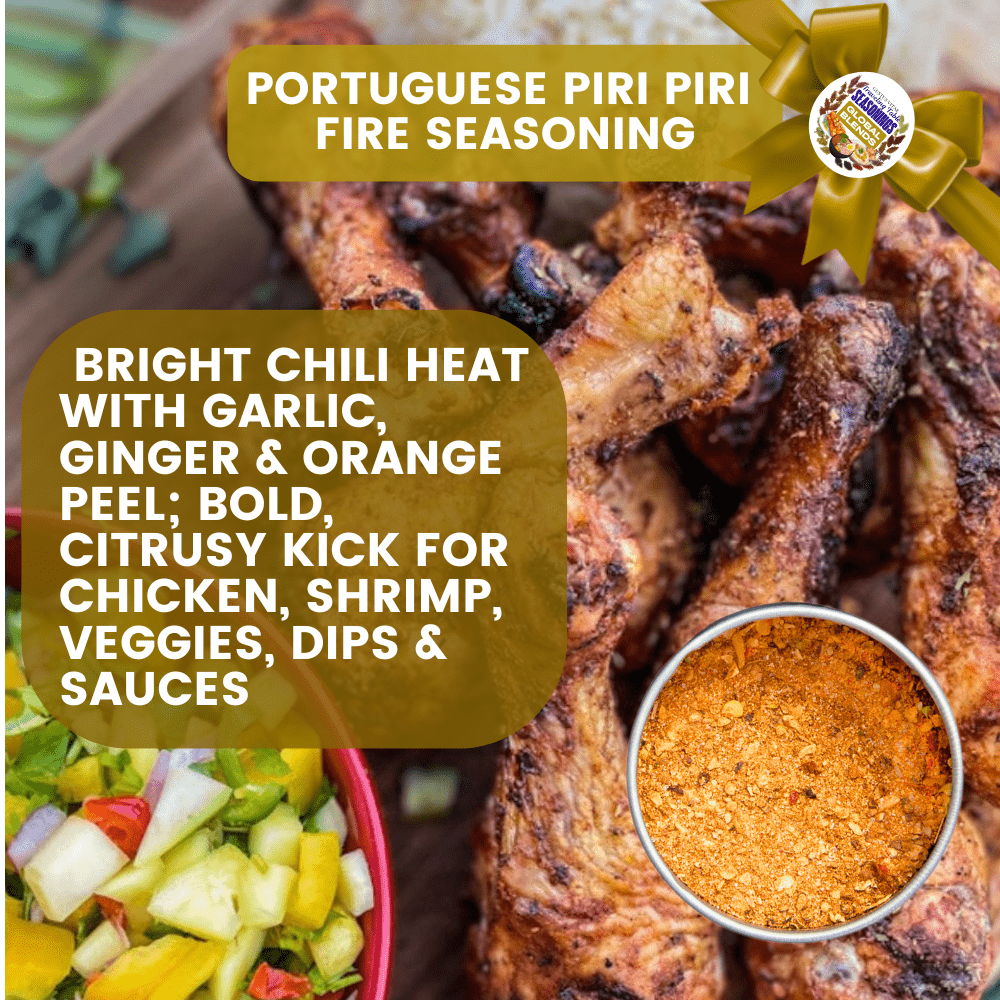 Portuguese Piri Piri Fire Seasoning — Bright chili heat with garlic, ginger, and orange peel; bold, citrusy kick for chicken, shrimp, and grill-night veg.