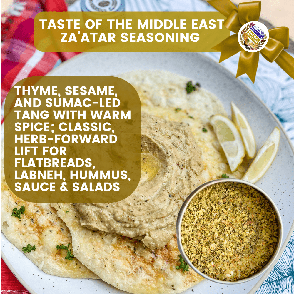 Taste of the Middle East: Za’atar Seasoning — Thyme, sesame, and sumac-led tang with warm spice; classic, herb-forward lift for flatbreads, labneh, and salads.