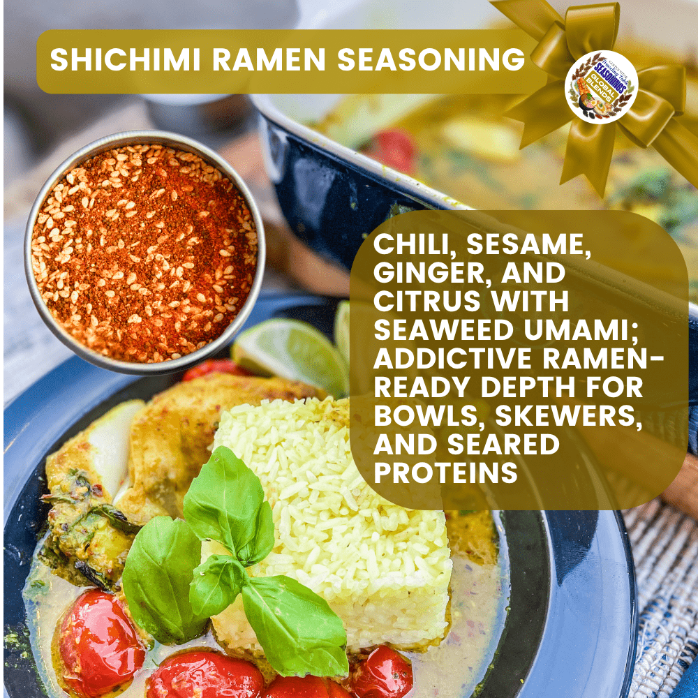 Shichimi Ramen Seasoning & Meat Rub — Chili, sesame, ginger, and citrus with seaweed umami; addictive ramen-ready depth for bowls, skewers, and seared proteins.