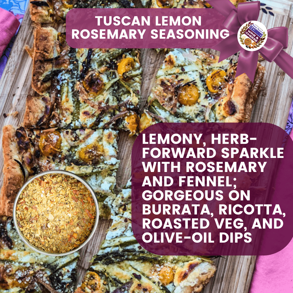 Tuscan Lemon Rosemary Seasoning — Lemony, herb-forward sparkle with rosemary and fennel; gorgeous on burrata, ricotta, roasted veg, and olive-oil dips.