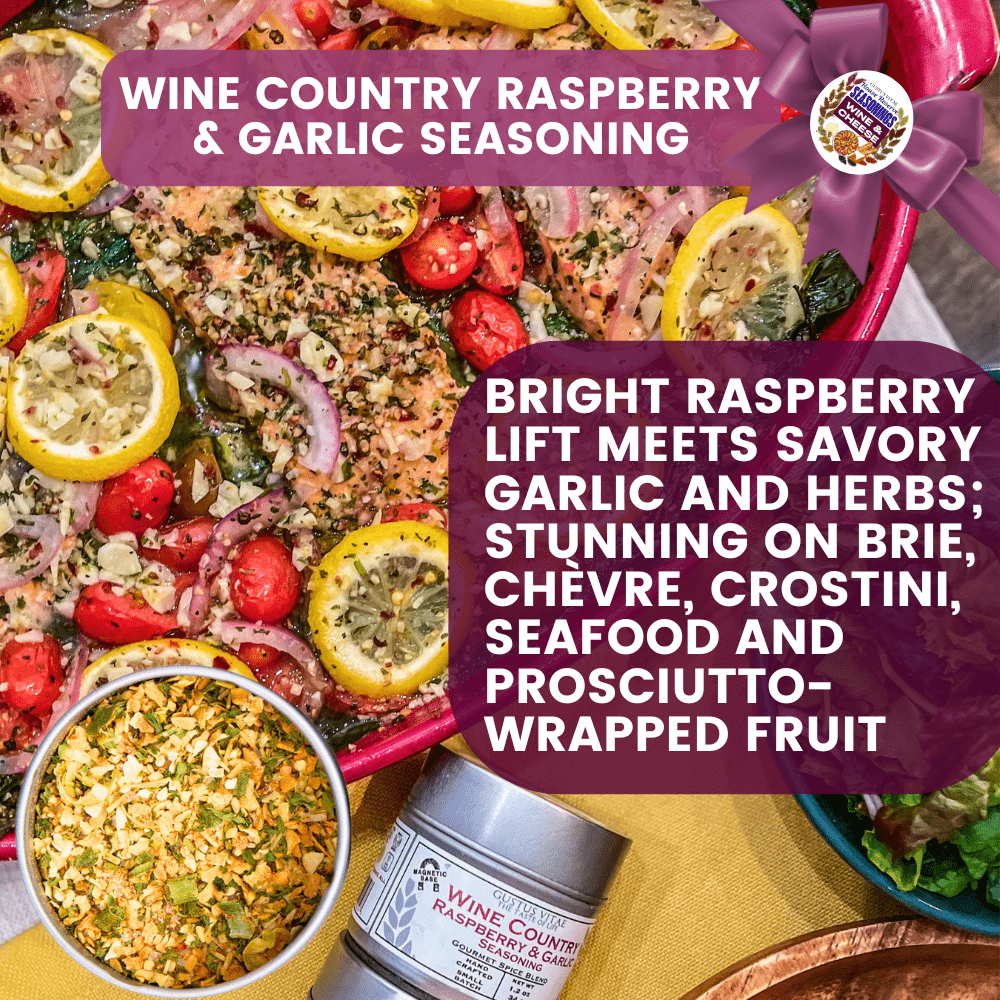 Wine Country Raspberry & Garlic Seasoning — Bright raspberry lift meets savory garlic and herbs; stunning on brie, chèvre, crostini, and prosciutto-wrapped fruit.