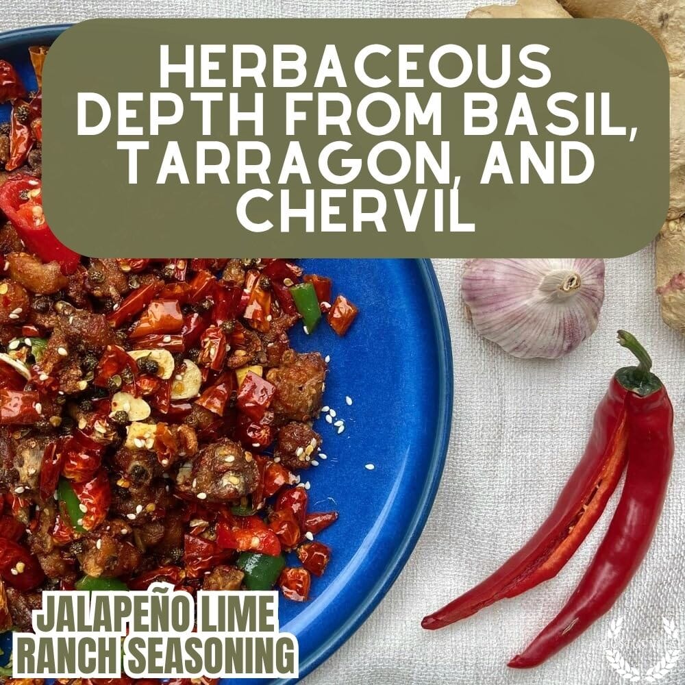Jalapeño Lime Ranch Seasoning Contains: Sea Salt, Onion, Sugar, Sour Cream Powder, Blue Cheese Powder (Milk, Salt, Cultures, Enzymes), Jalapeño, Lime Juice, Coarse Sea Salt, Dill Tips, Chives, Garlic, Basil, Chervil, Tarragon, Kaffir Lime, White Pepper, Parsley.