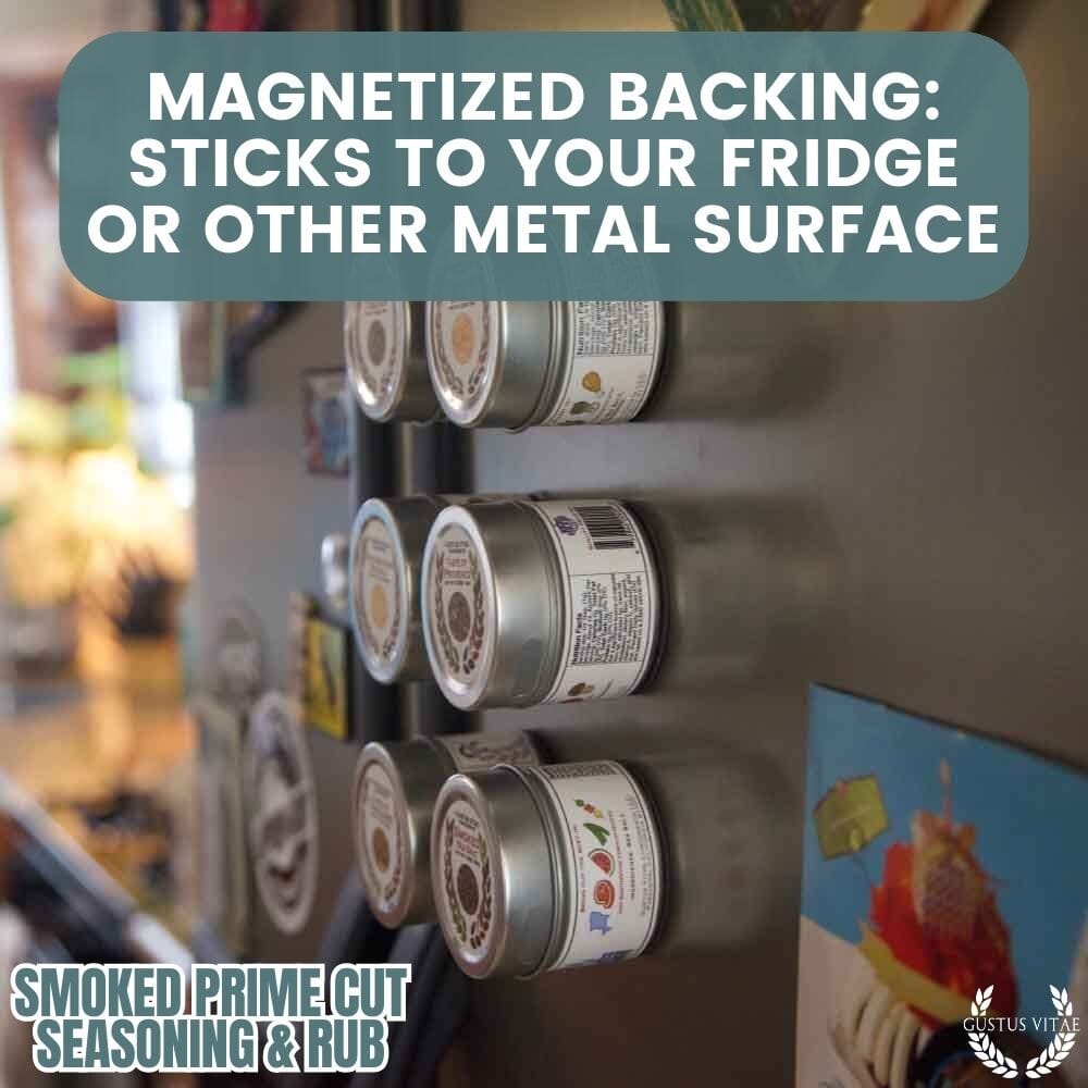 Magnetized backing: tins sticks to your fridge or other metal surface.