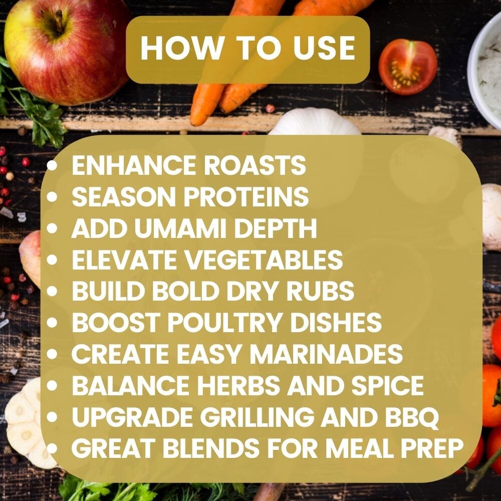 Everything But The Umami Butter Herbs & Seasoning — Deep, buttery savoriness with crave-worthy umami; boosts browning and richness on chicken, skin-on cuts, and pan sauces.