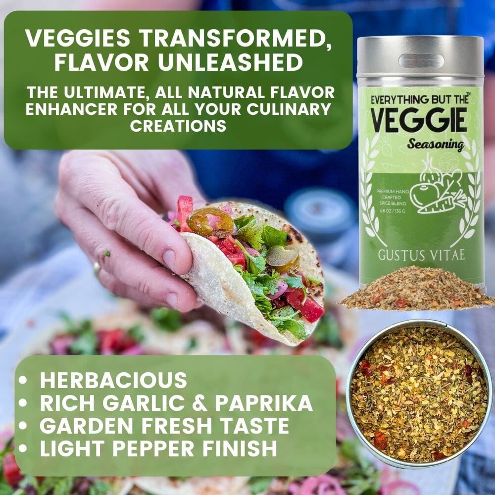 Everything But The Veggie Seasoning — Bright, clean, and herbaceous; enhances roasted vegetables, chicken sides, and lighter poultry dishes.