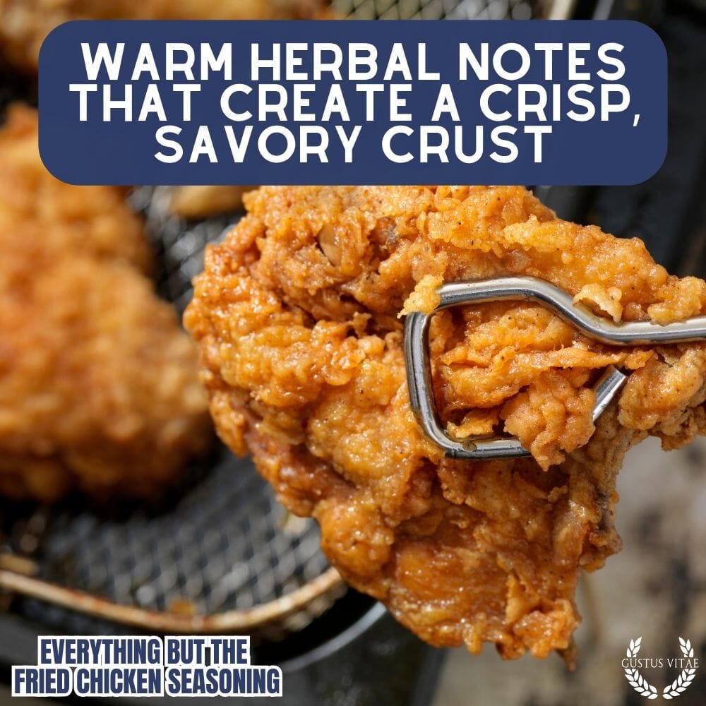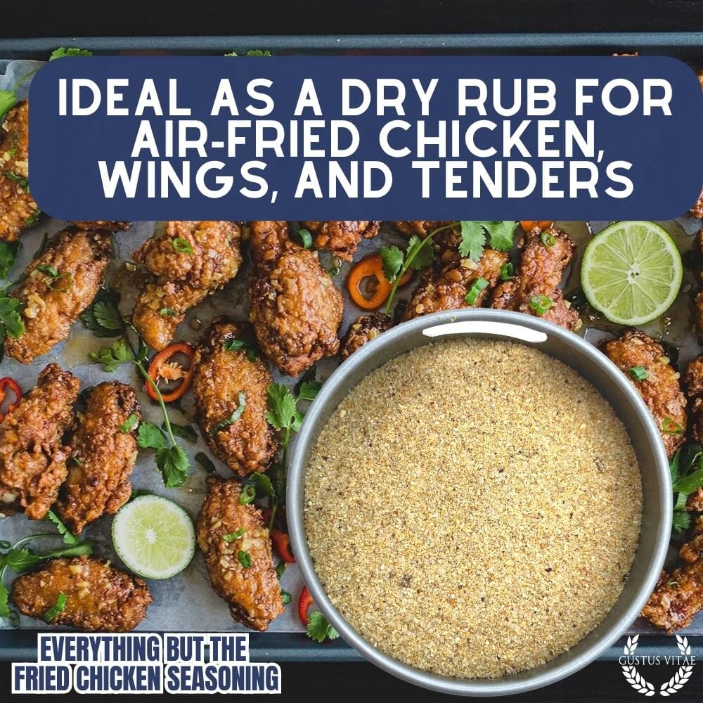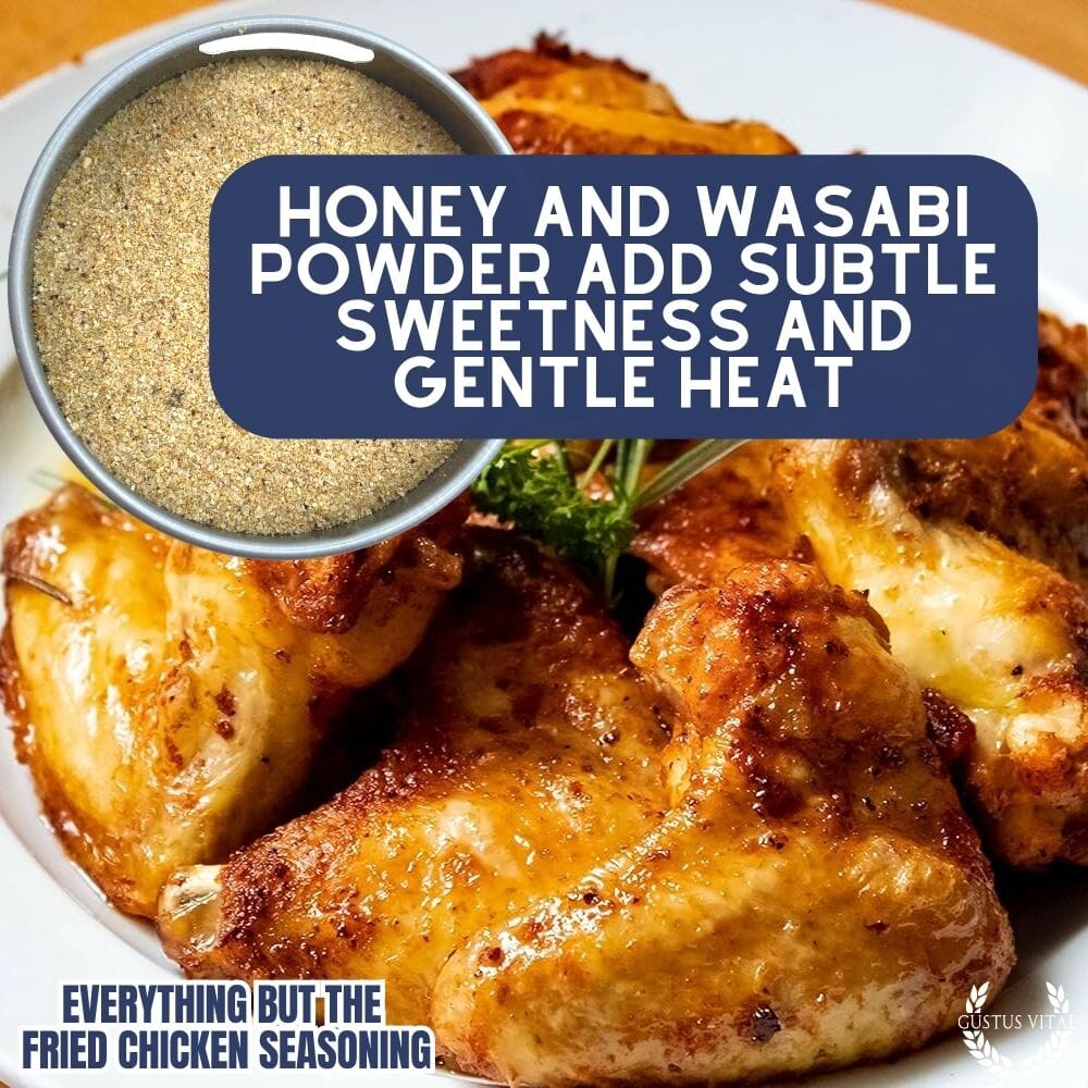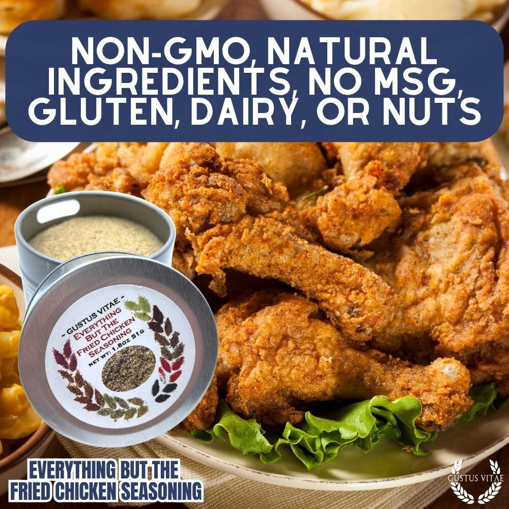 Everything But The Fried Chicken Seasoning Contains: Garlic, Salt, Black Pepper, Sugar, Mustard Powder, White Pepper, Thyme, Sage, Celery, Basil, Chili Pepper, Ginger, Wasabi Powder, Honey, Rosemary.