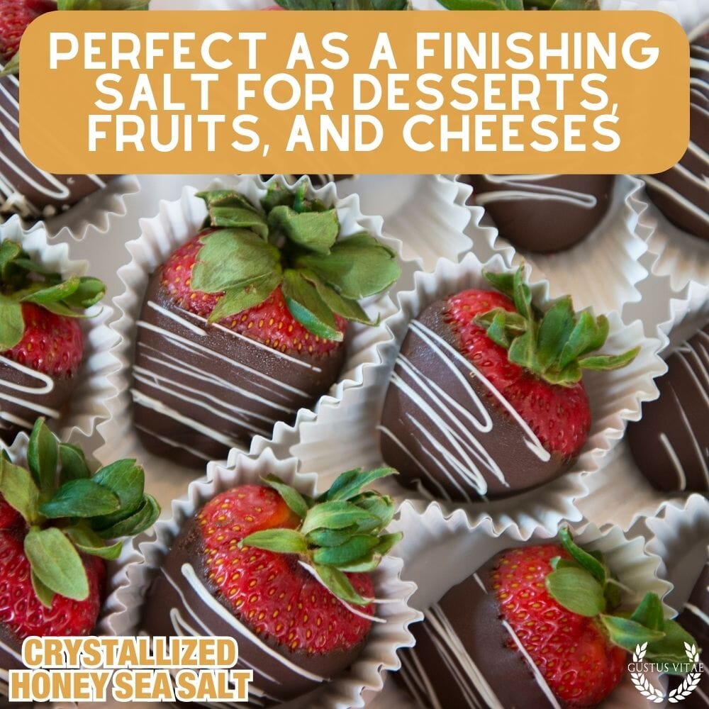 You'll have to forgive us the pun, it was just too easy. What's hard is discovering what your favorite way is to use this sea salt: as a delicious sprinkling on ice cream? The magic dusting on white fish just before serving (you'd be surprised!)? Sprinkled over freshly popped popcorn? We could go on, but that'd take away (some of ) the fun. Our crystallized honey sea salt is incredibly versatile as a finishing salt and is sure to become one of the secret weapons in your kitchen. Our favorites: lifting a fruit plate to new heights, as a caramelizing dusting on salmon just before baking or grilling, sprinkled on blue cheese to somehow both turn down up and down the funk, and as the best margarita rimmer you've ever experienced.
