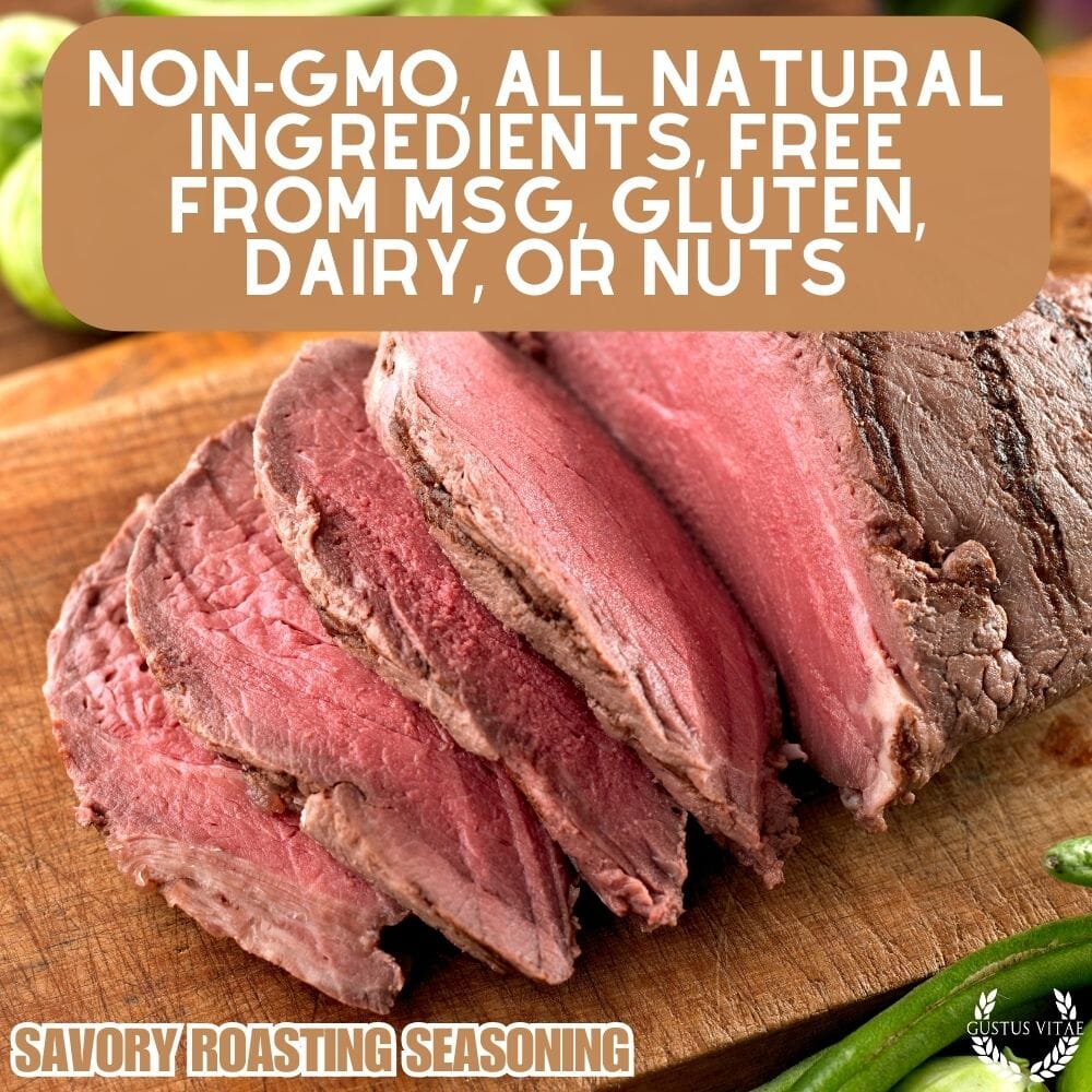 Savory Roasting Seasoning Contains: Garlic, Onion, Sea Salt, Black Pepper, Sesame Seed, Parsley, Basil, Red Bell Pepper, Cane Sugar, Thyme, White Pepper, Dill, Oregano, Jalapeño, Celery Seed, Chives, Poppy Seed, Bay Leaves, Marjoram, Lemon Peel, Paprika, Cilantro, Red Cayenne.