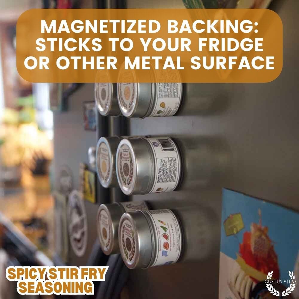 Magnetized backing: tins sticks to your fridge or other metal surface.