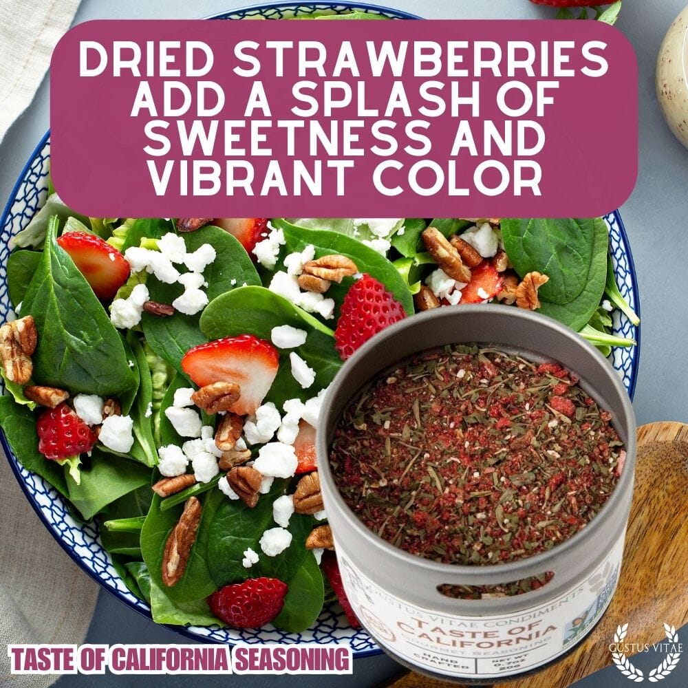 What do dried strawberries, cilantro, thyme, tarragon and lemon zest have in common? They're all ingredients in our signature gourmet seasoning blend known as the Taste of California. This savory mix of herbs, fruits and spices launches a veritable orchestra of flavors in your mouth. We're not kidding.