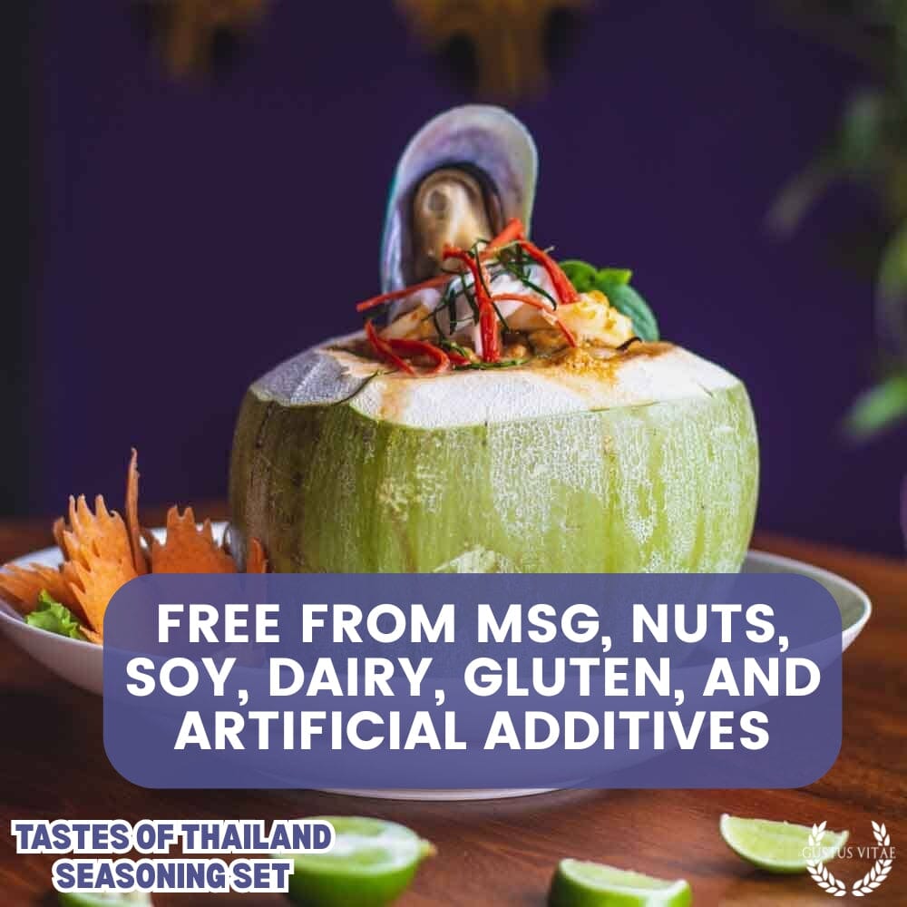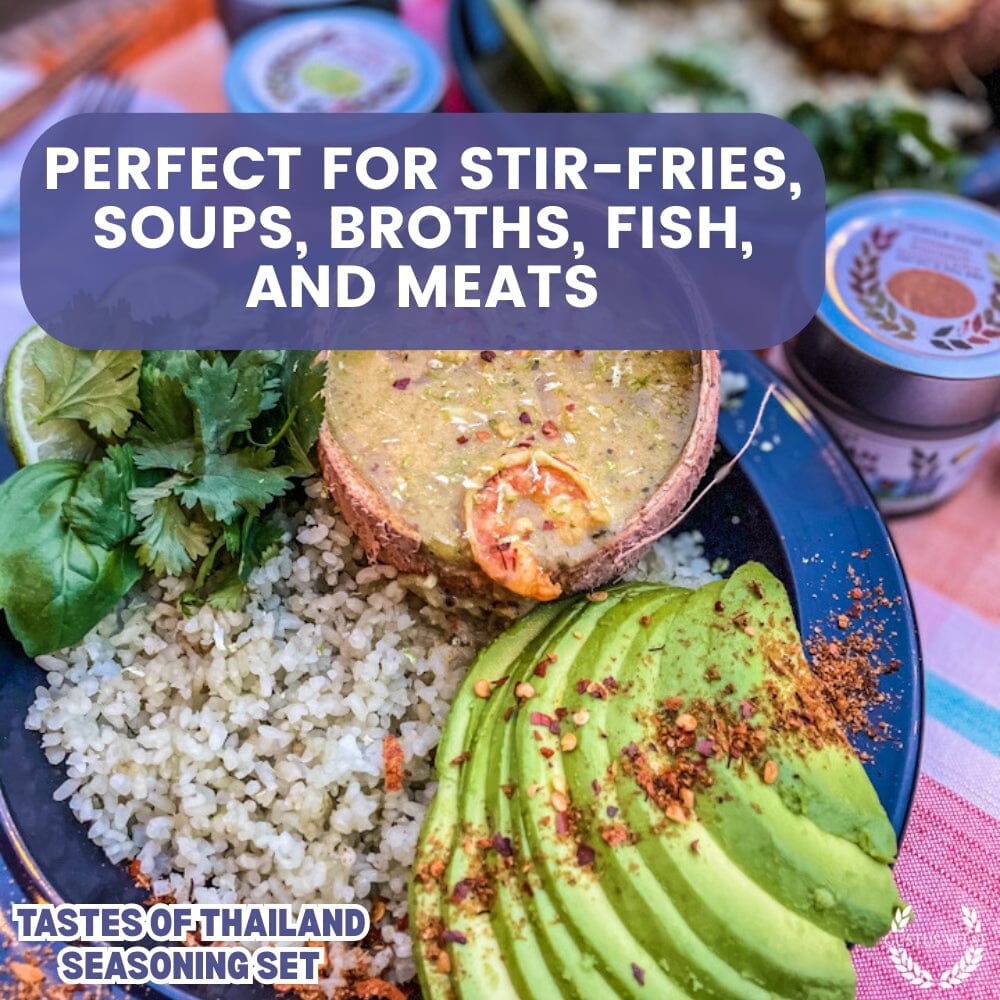 Spicy Thai Seasoning: California Sea Salt, Ginger, Basil, Red Pepper, Cumin, Cardamom, Black Pepper, Garlic, Onion, Red Bell Peppers, Cilantro, Turmeric Extract and Garlic Oil.